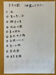 8月は、写真の10曲の中から、それぞれのご利用者様に「好きな歌・歌いたい歌」を3曲選んでいただいています。懐かしい思い出がよみがえったり、自然と口ずさんでしまったりと、皆さんとても楽しそうに選曲されています。