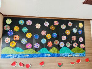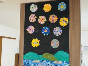 色とりどりの紙を切ったり貼ったりしながら、「こんな花火見たことある!」と、会話がはずみ、楽しく取り組まれている様子が見られました。 完成した作品は、華やかで、とてもきれいに仕上がりました。