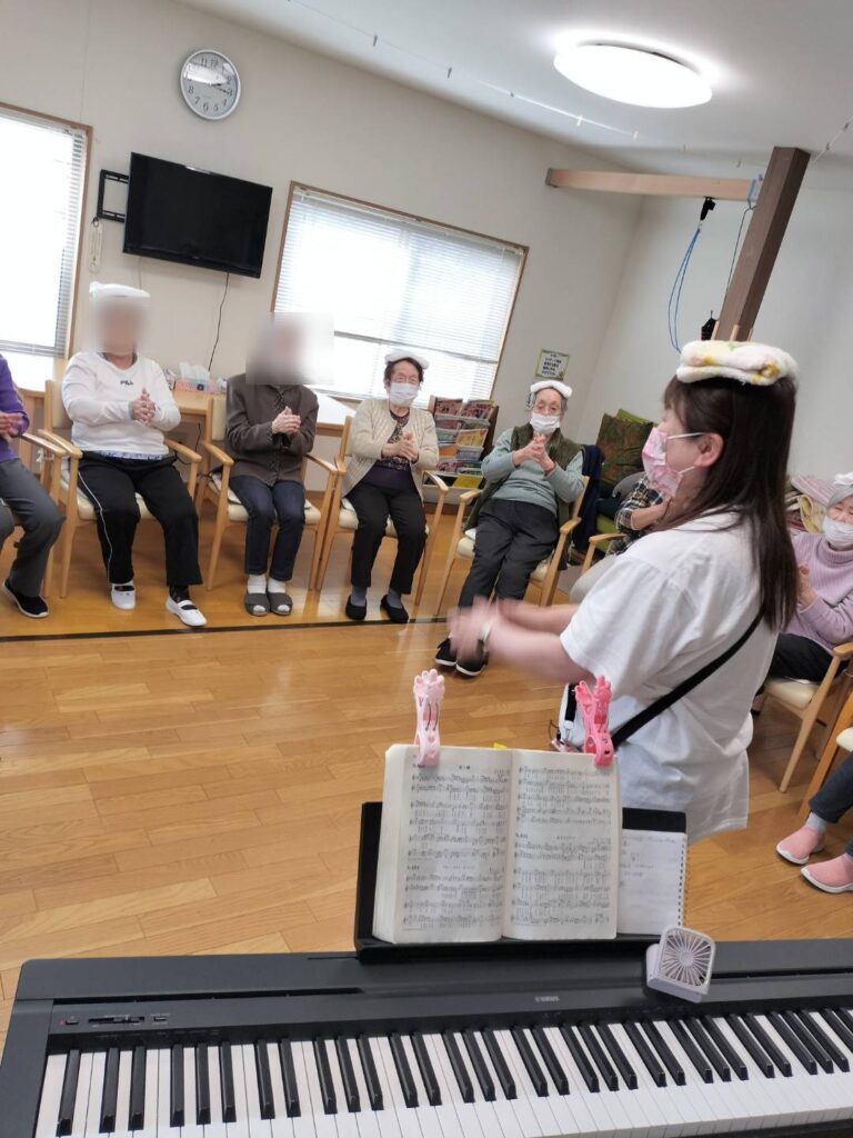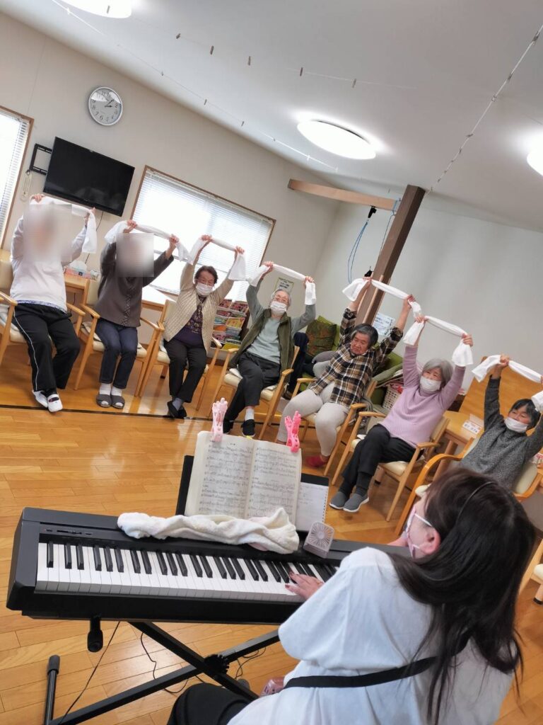 今日の音楽療法では、歌をうたいながらタオル体操に取り組まれました。
