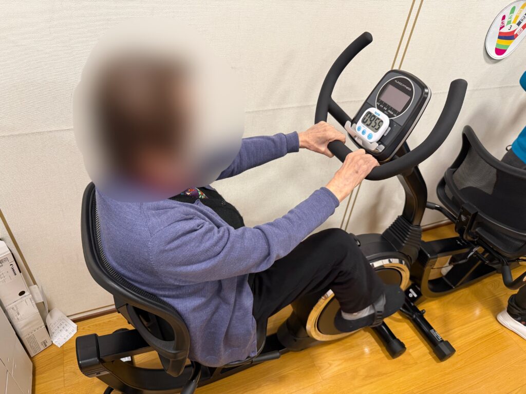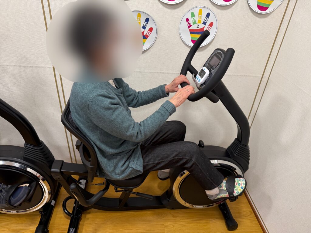 本日午前中の機能訓練のひとコマです。 リカンベントバイクに乗り、10分間のサイクリングに挑戦されました。