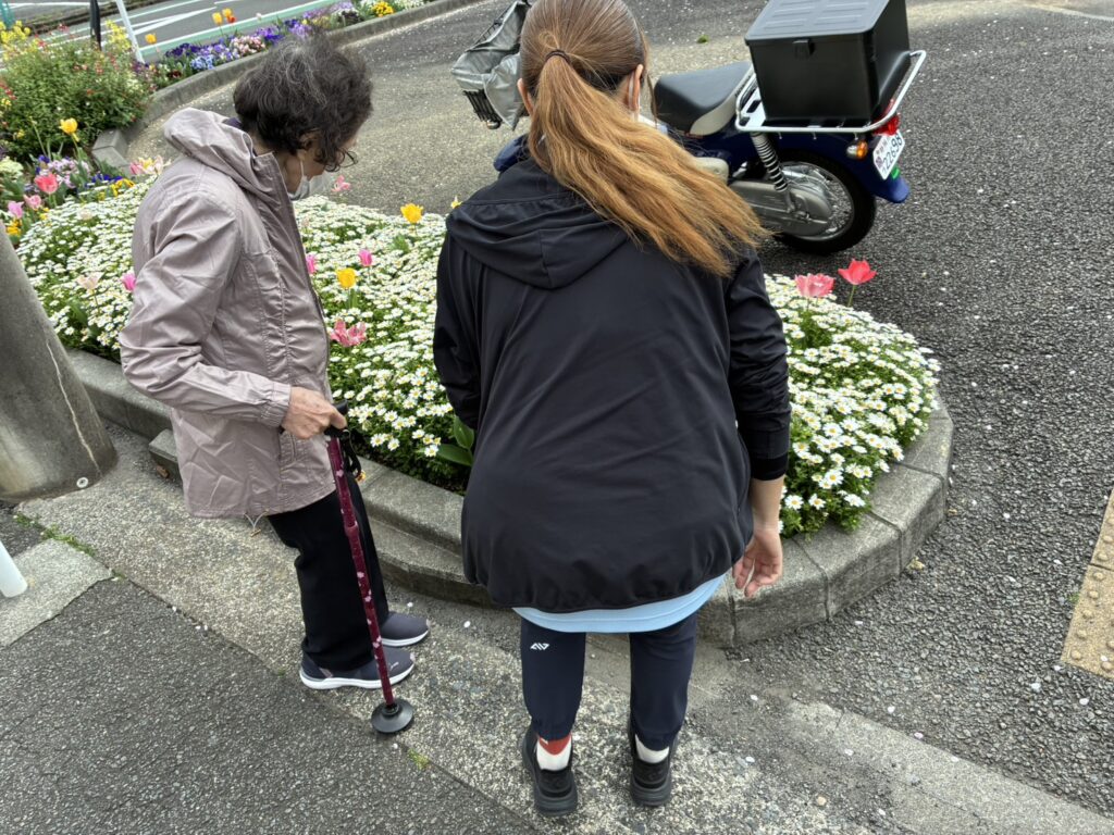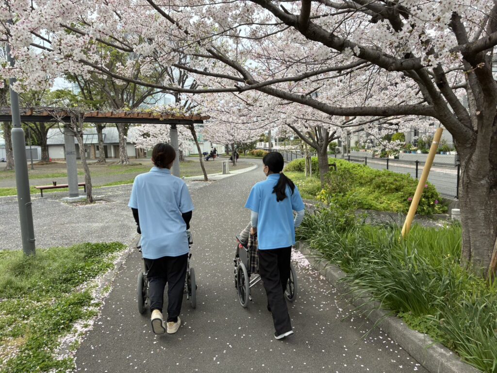 公園の桜は満開を迎え、少しずつ散り始めており、春の移ろいを感じながらの歩行訓練となりました。
