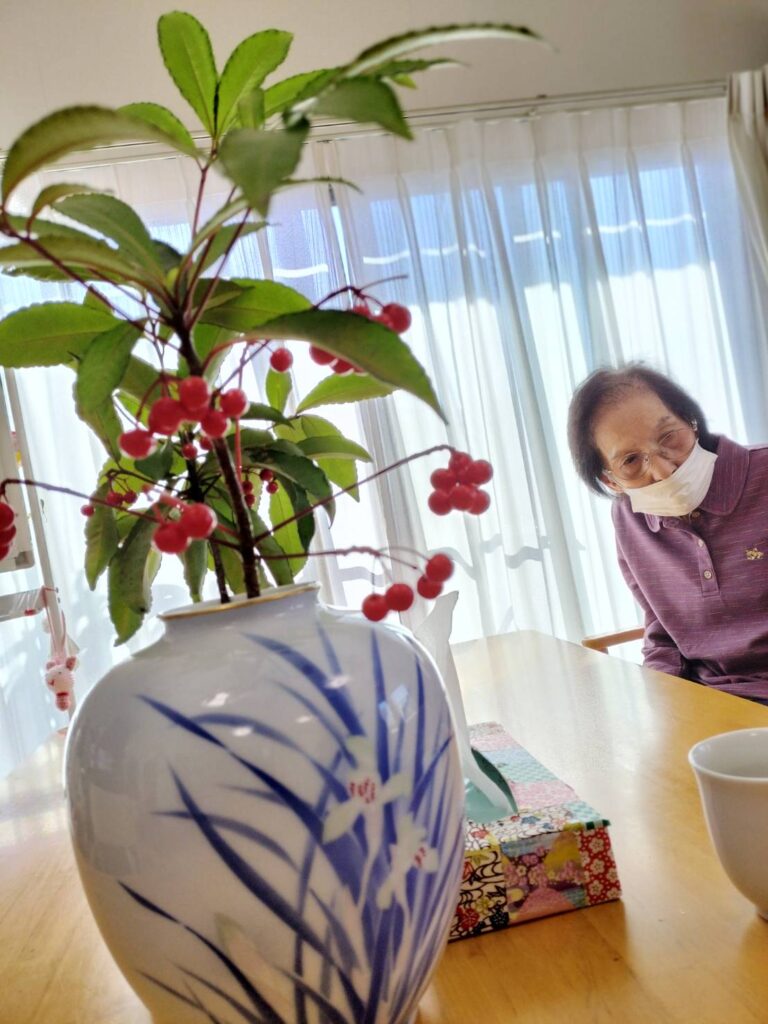 今日は利用者様がご自宅の庭から『万両』を持ってきて下さいました