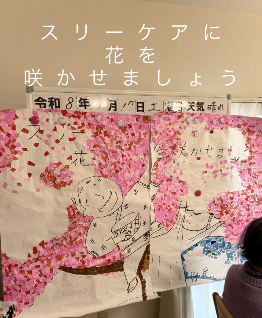 スリーケアの入り口は、利用者様や職員が持ってきてくださった飾りで、とても華やかな雰囲気になっています。